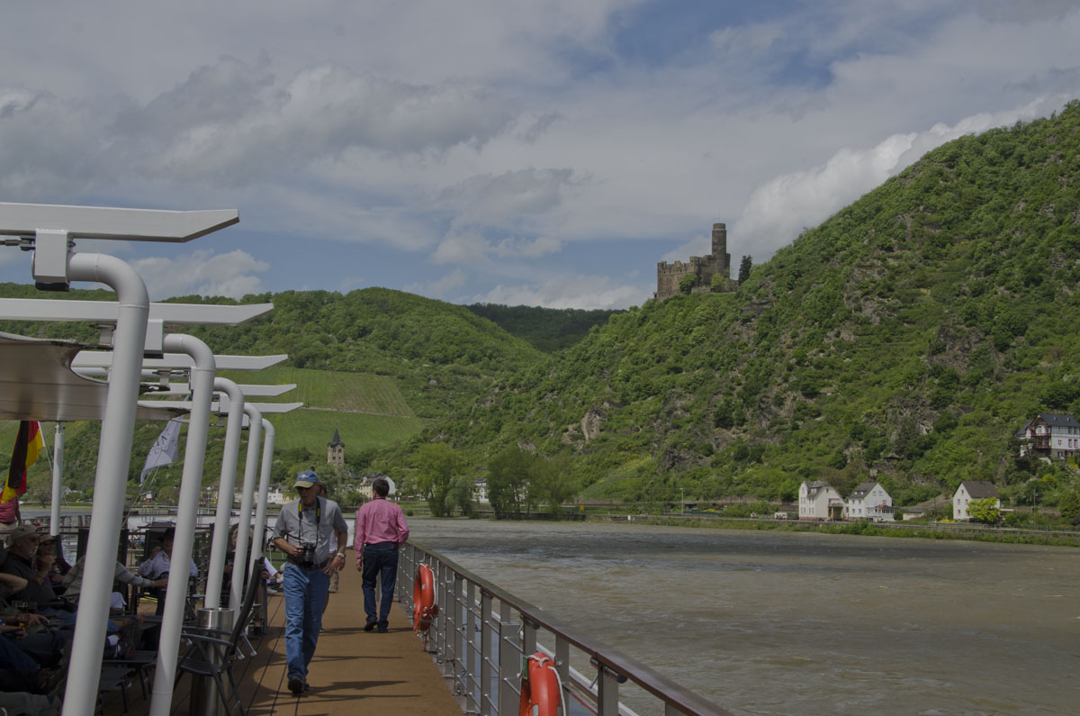 This picture shows passengers up on the sun deck (in the shade and out of the wind, on the left side) as we cruised down the Rhine looking at castles,like the one on the right.