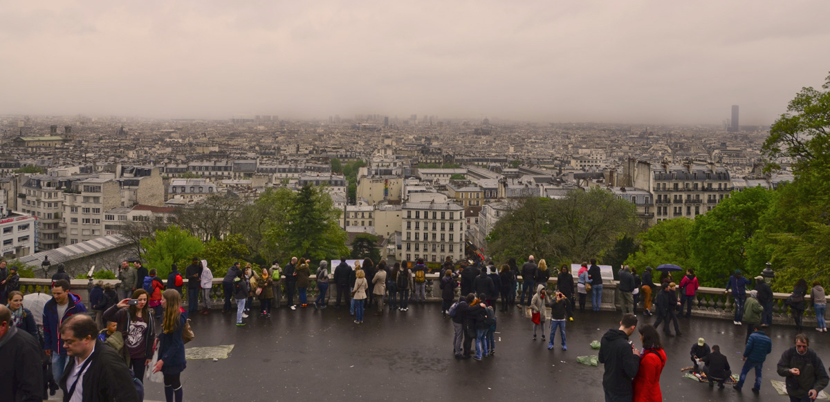 Mid-day we napped and then met again about 5:00 with an evening in Montmartre on the schedule. Cindy and Greg opted out (sleep catch up is still their major focus), but Gerry and I shepherded Luis, Joanne, Judy and Rod onto the Paris metro, and through a Metro construction detour, to the Abbesses stop in Montmartre. From here it was a short walk to the funiculaire. We took that up to the square in front of Sacre Coeur, to see an albeit foggy view of the city stretched out below us.