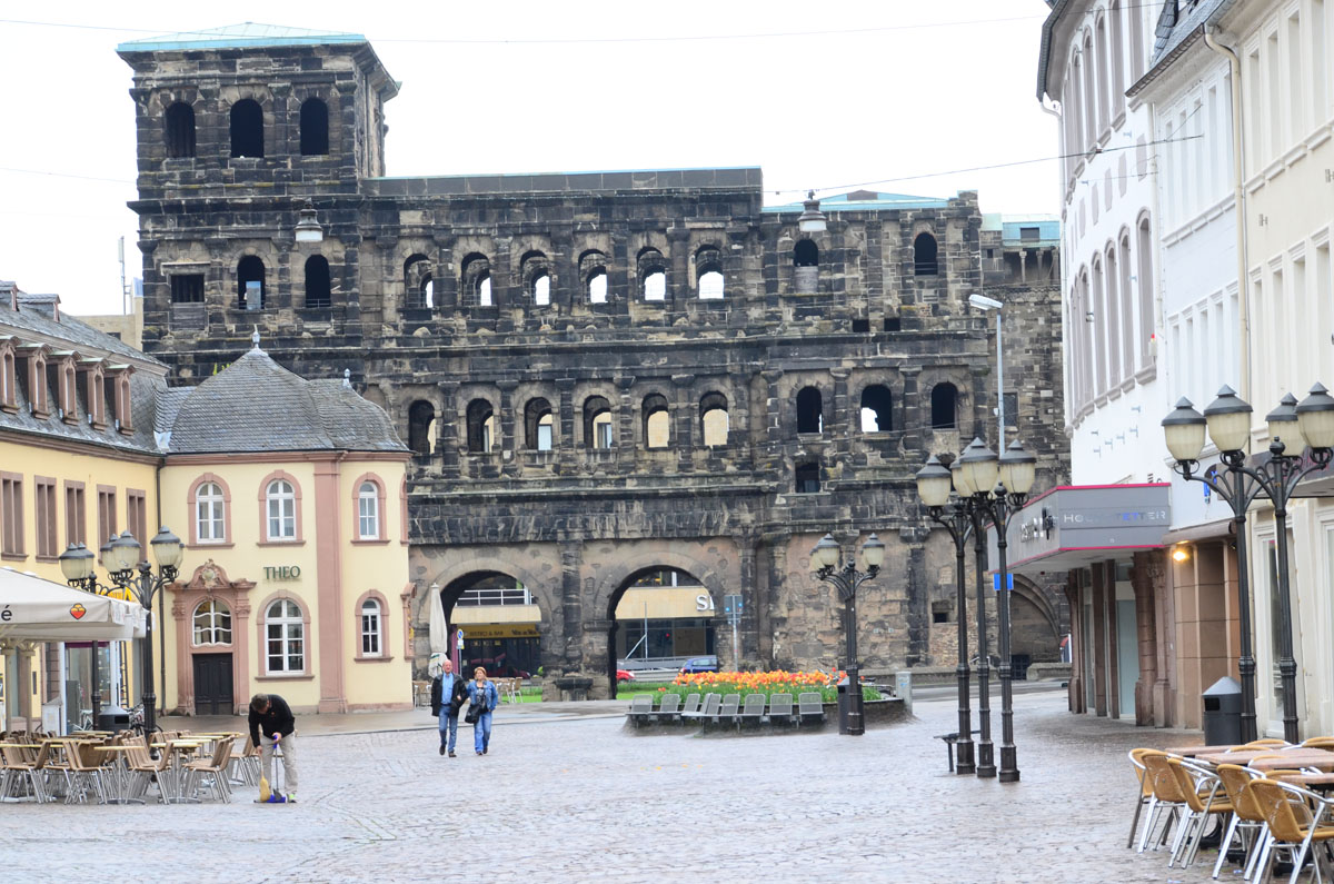 This morning we are still docked in Trier and Gerry and I opted not to take the guided walk through town, but to go on our own. The weather is drizzly again, but not continuously. From the boat we wandered through bars and eating places right along the water. They must have been lively the night before, (Saturday night) but this morning every place is shuttered and quiet. Walking into town takes about 10 minutes, and we see almost no one. It is a wonderful way to take pictures of the town. The buildings of the town are varied and fascinating – everything from half-timbered to plaster details. Our first “sight” is the Dreikonigenhaus, a strange looking Italianate façade with a coffee shop below, that looks a little like a McDonalds. But the Porta Nigra (the Roman, 4th century “Black Gate”) dominates the scene, a massive black structure that once defended the town.