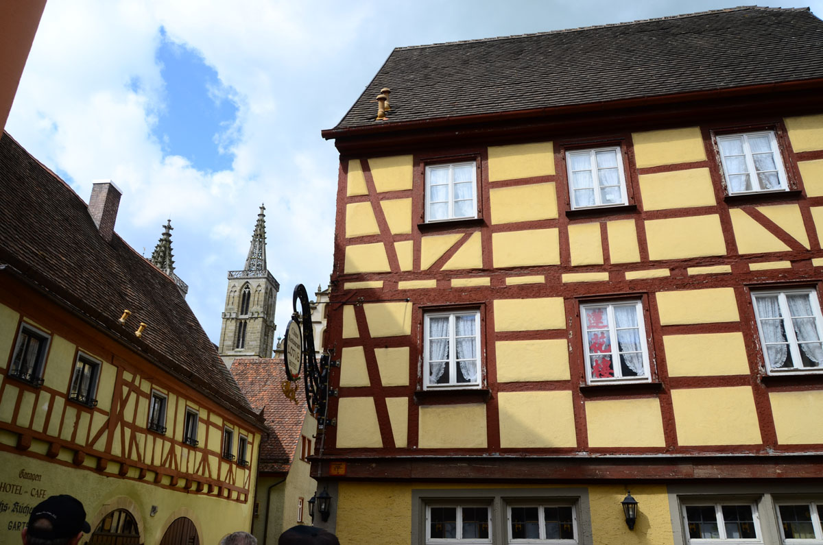 Once in Rothenburg, we toured the city with our guide. Here again, we are in the middle of a medieval city that is well restored. Surrounded completely by ancient walls, Gerry and I managed to ascend the stairs and walk along the top of the wall. The top is covered (sometimes the roof is low enough to hit your head) and you can peer out the occasional archer’s slit to the outside, or you can peer down onto the houses and street of the inner town. It is an interesting perspective on the town that you shouldn’t miss.