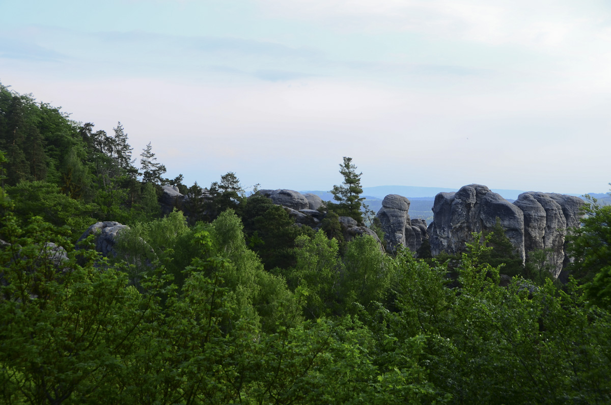 That evening, we sat out on our balcony drinking champagne from the Viking ship, and enjoying the beautiful evening. In the far distance we could make out the towers of the Trosky Castle. Closer at hand, promised views of the rock formations were obscured by new green growth on the trees. The sky was interesting, and darkness finally fell long after we were asleep.
