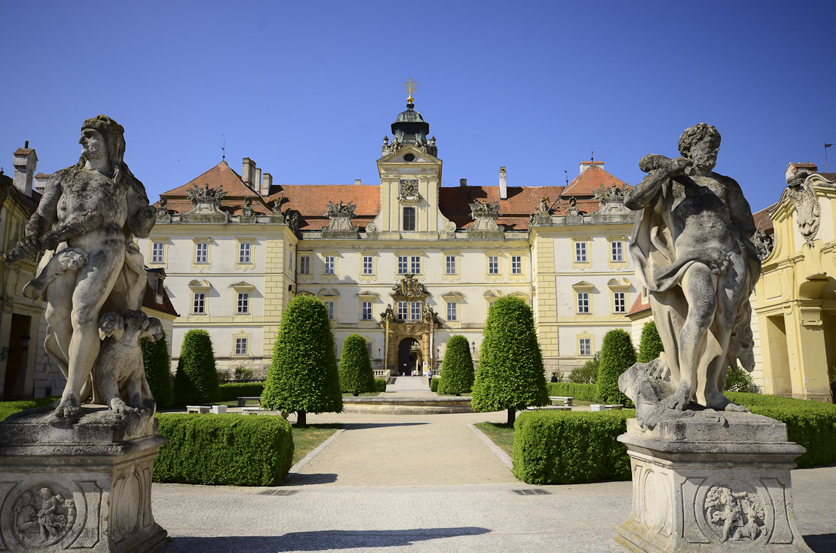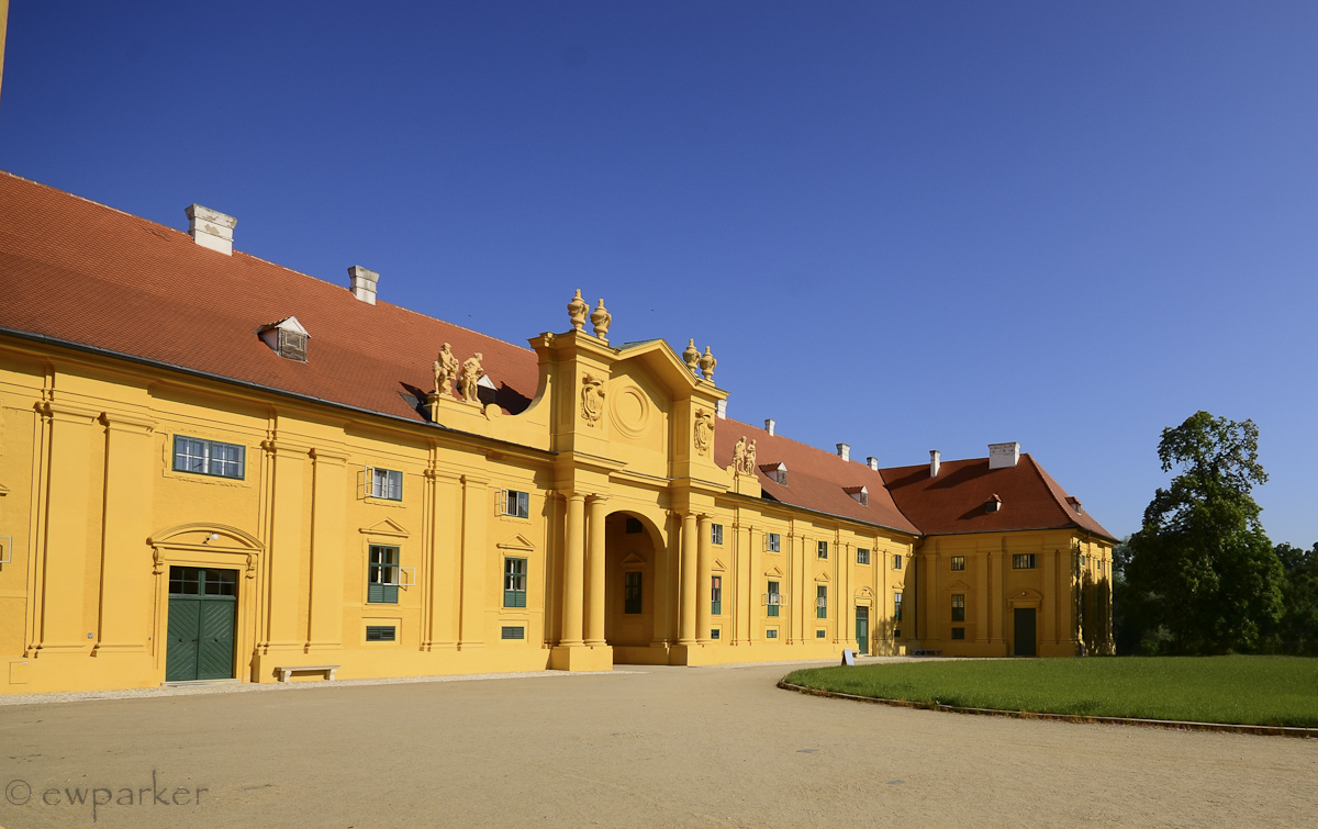 Then we drove to the “sister” castle at Valtice. I call it “sister” because it was owned and built by the same family. Someone commented that one was the winter palace and the other the summer, but actually Valtice is the older palace, more staid and conservative, and Lednice is the younger, far more fanciful. They are just 4 miles apart connected by their park lands, and supposedly you can walk from one to the other. I wanted to do it and had planned for this, but there wasn’t time, so we drove. Valtice appears a “sad sister” compared to Lednice, not nearly so impressive to look at and the gardens are not maintained. However, our guidebook says we should have visited both inside and out. Make that a note for another trip!