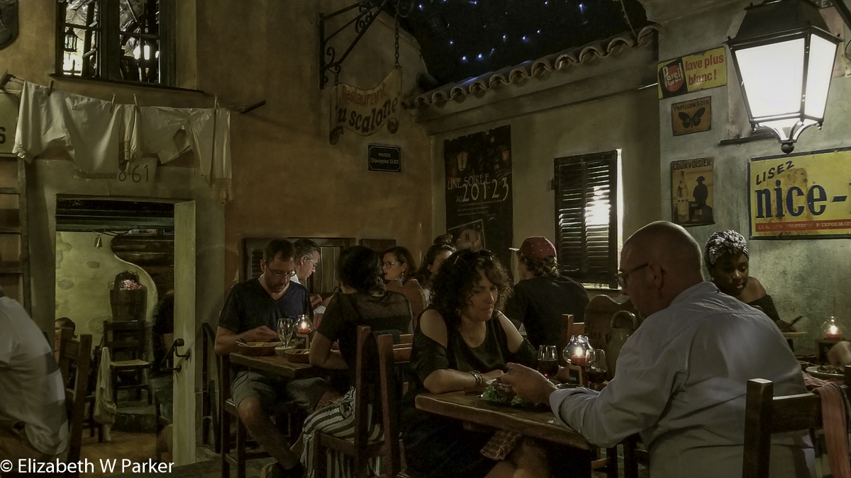 We had a lovely and fun dinner at A Cantina di Ghjulia. The food was home-cooking Corsican: We had zucchini and zucchini flower fritters to start. Now there is something I haven’t eaten in 40 years – zucchini flower fritters! They were delicious! The service was lots of fun, all family and friends. Ghjulia the cook, is the mother, Dad welcomes guests on the patio, Andree, the daughter is the maitre’d and her best friend is the waitress/busgirl/ etc. Very nice dinner! You must make reservations! They have only one seating for dinner and the place is small. Definitely worth making the effort!