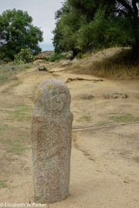 Filitosa is the first site of menhirs we will see on this trip. Made by people who lived in this area of Corsica in about 6,000 BCE, menhirs (literally long stones) are large slabs of stone, some carved in bas-relief, others unadorned. Whether they were never adorned or have lost their carving with weathering, I do not know. On some of the most impressive stones the carving is quite clear. What is curious is that the carved stones show metal armaments, something the people of this site would not have seen, acquired or made until the Bronze Age, fully 3 millennia later. According to Lonely Planet, the stones were erected by the people who conquered the megalithic people. They were subsequently vanquished by Torreens (tower builders). One of the theories that Carrington describes is that the stones may mark communal graves. For these ancient peoples, perhaps being buried en masse helped to protect the living.