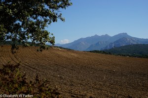 The day began with a hike through the macquis, the Mediterranean scrub that is iconic of Corsica (and called macchia in Sardinia). Farmers’ fields bordered our path. The way is lined with oak trees. Not the large spreading oaks that I know in Wisconsin, but lovely shade trees nonetheless. We finally arrived at the Plateau de Cauria also called I Stantari Here, we saw megalithic stone menhirs standing, in their original positions. Probably because of the remote location of the site these were never destroyed – or tipped over and broken (imagine a cow using it for a scratching post…).