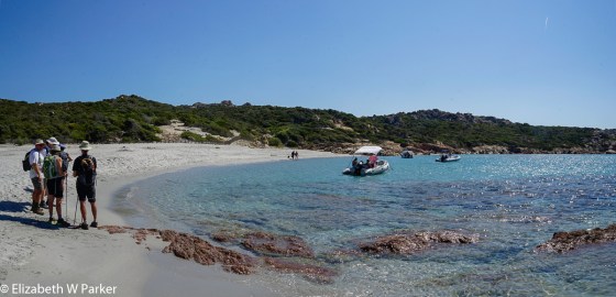 The Silver Beach, or Plage d’Argente, was wonderful. Not large but not a cala either, the beach is a beautiful arc of silver sand right up to the gorgeous sapphire water that surrounds Corsica. The sand must be the product of bleached corral, as all around is the golden sandstone that makes up the yellow sand that is much more common. We took a momentary rest, but continued on to a larger beach, a long wide sweep of beautiful beach, la Plage de Tralicetu and that same sapphire water.