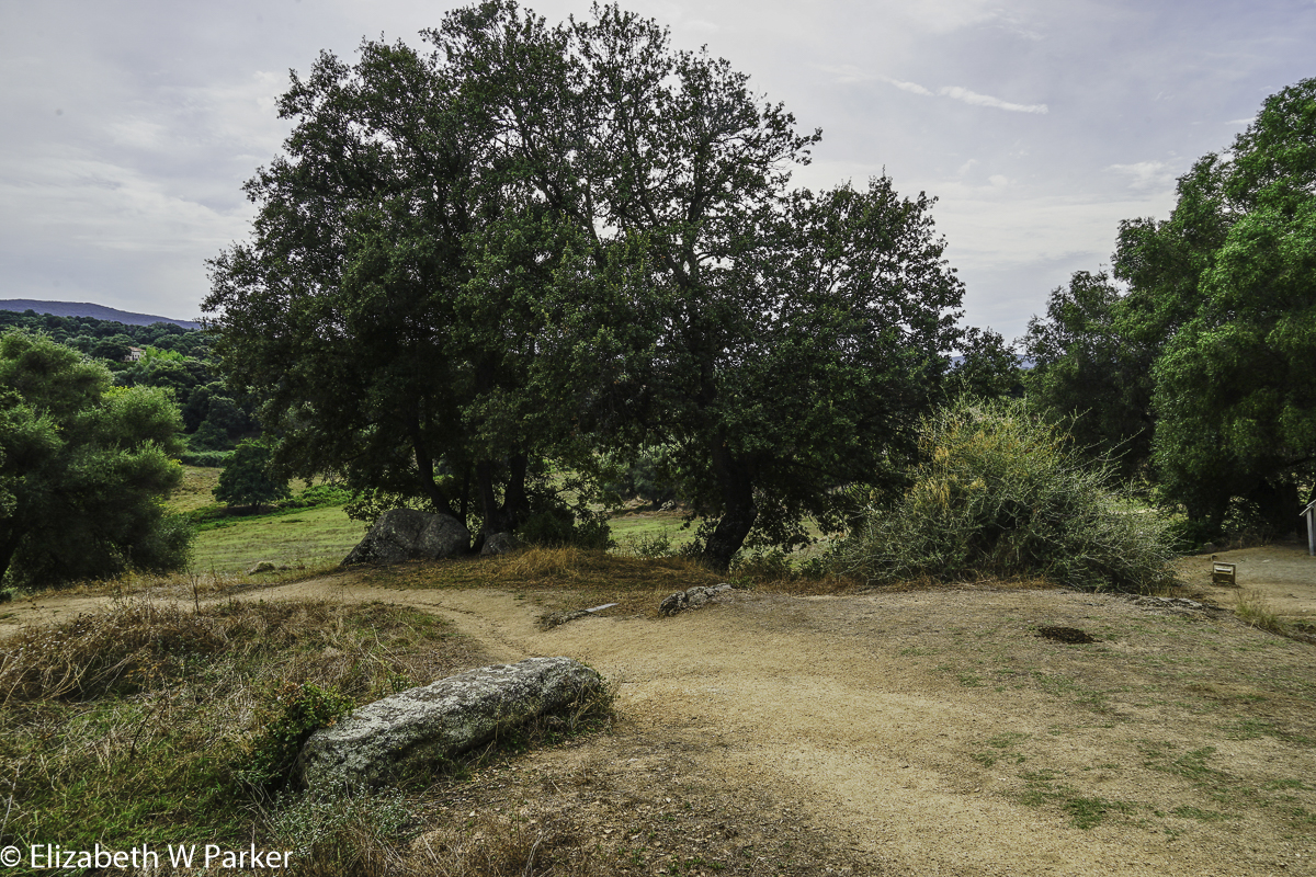 The day began with a hike through the macquis, the Mediterranean scrub that is iconic of Corsica (and called macchia in Sardinia). Farmers’ fields bordered our path. The way is lined with oak trees. Not the large spreading oaks that I know in Wisconsin, but lovely shade trees nonetheless. We finally arrived at the Plateau de Cauria also called I Stantari Here, we saw megalithic stone menhirs standing, in their original positions. Probably because of the remote location of the site these were never destroyed – or tipped over and broken (imagine a cow using it for a scratching post…).