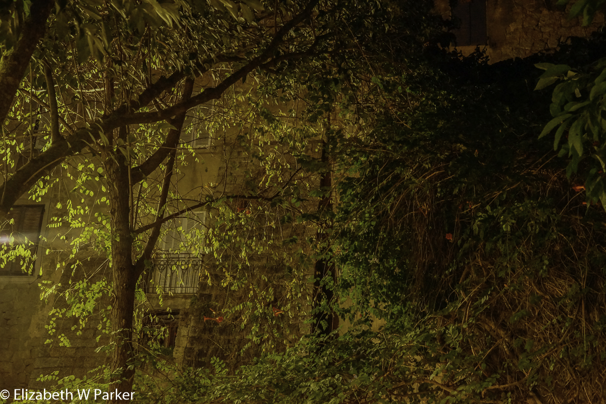 This evening we were back in the hotel in Sarténe, and had a group dinner in restaurant nearby, Les Jardin de l’echauguette. What a magical place to eat! We were at a long, long table (there are 18 of us including our 3 guides). We’re under the trees with lights overhead in the leaves. Tucked behind a stone building,, under the protection of the city walls, other buildings rise around us like a cocoon. The food is abundant, the conversation lively. Life is supposed to be lived like this!