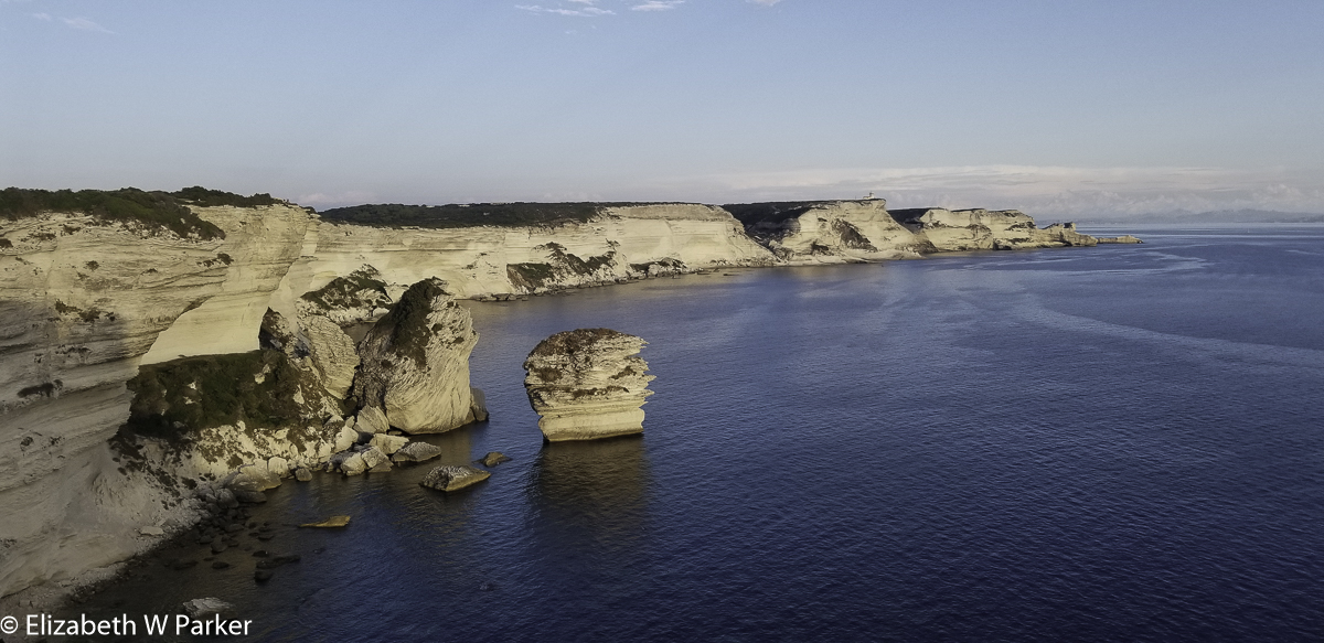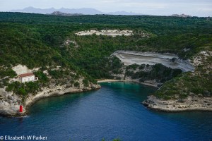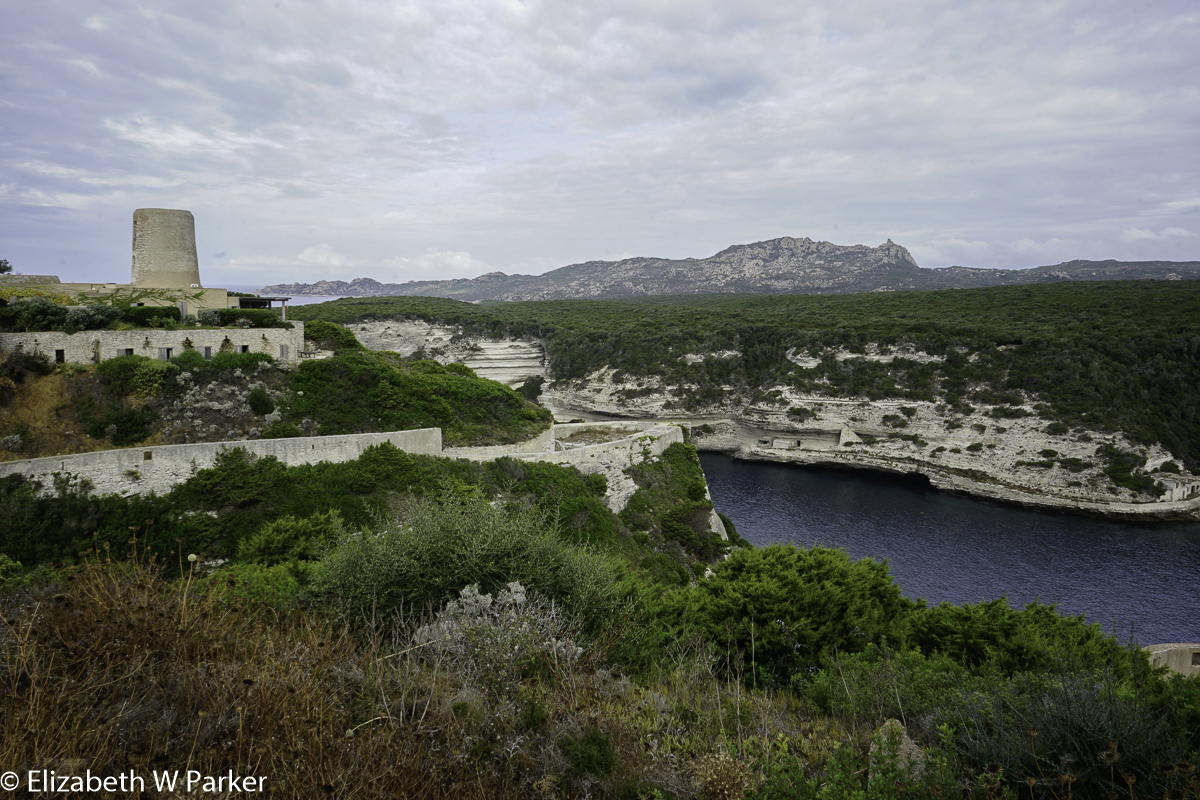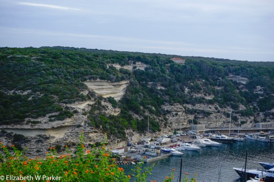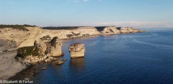 Bonifacio is a long promontory. It’s natural harbor is cut deep into the limestone on which the city sits, sometimes quite dramatically on an edge that has been eroded away beneath! As we look north, from our hotel, the harbor is below us and the upper city is to the east. Our walk took us out along the ramparts and the cliffs to the very end of the promontory.