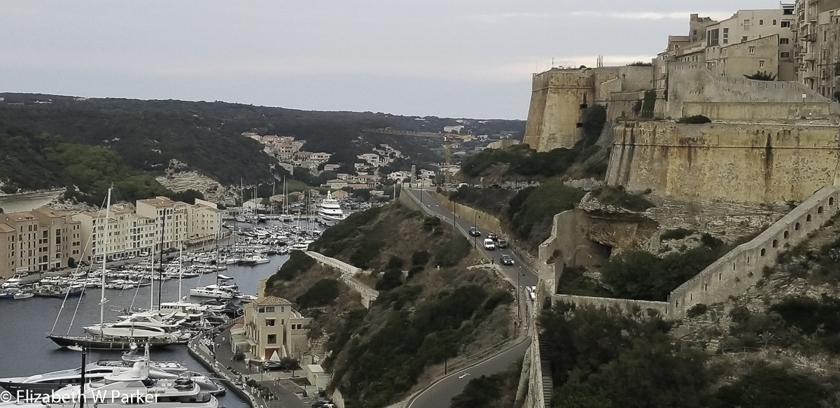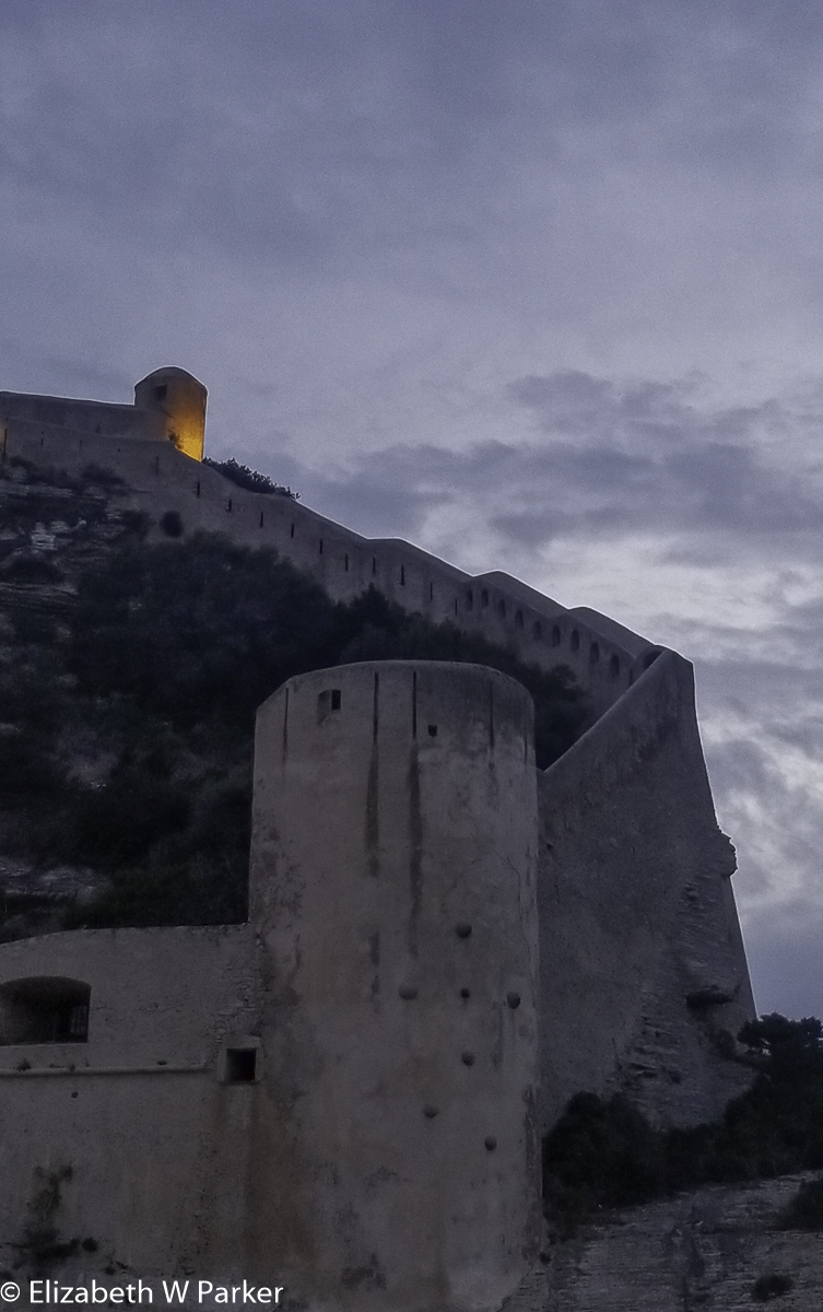 The tower is basically our hotel. That long, descending wall is where we walked down to the harbor. Bonifacio, Corsica