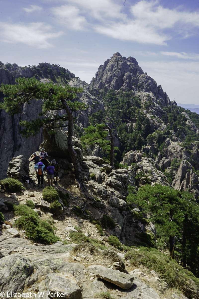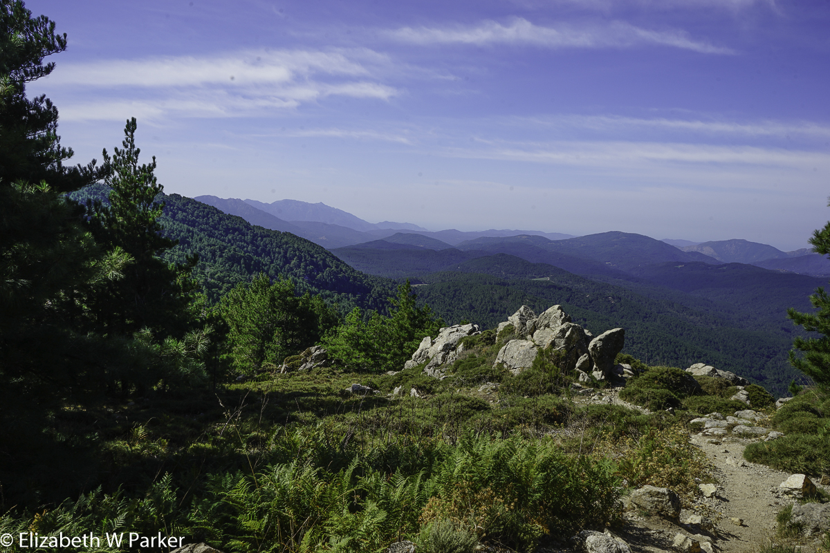 The car park was pretty full, and you’d almost despair that the trails would be, too. But, the place must be huge, because we were never overwhelmed by other people. The really outstanding places were pretty well-attended, naturally, but the hikers were spread out on the trails. Here the walk was through the woods, large beautiful pines (laricio var corsicana) with a carpet of ferns underneath. In places, the ground was so churned up it looked like the spot of a mighty life and death struggle. It was apparently the rooting of wild boars. The air was fresh and clear. The views were spectacular.