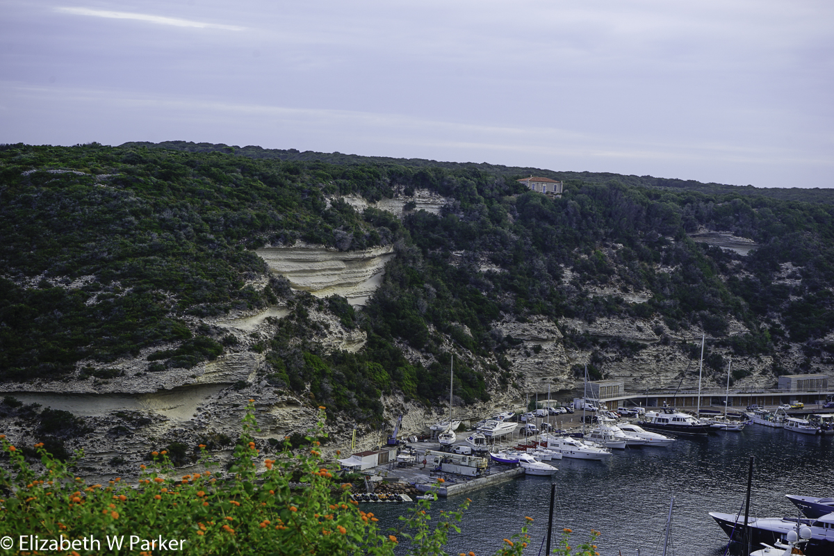 As we walked along the Bonifacio ramparts, we were looking down to the harbor below. The harbor is pretty impressive and has a lot of history. Today, it is filled with impressive yachts, but you can see by the protective curves of the inlet from the sea, that the harbor would be protected from storms as well as attacks. There are even WWII gun placements cut into the limestone cliffs.