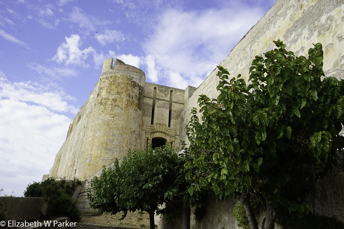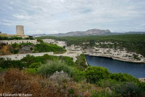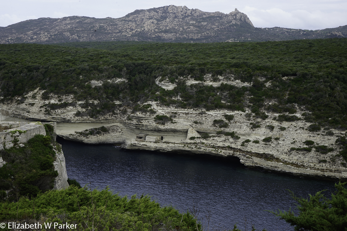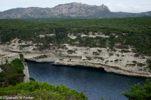 We left the city via a massive gate in the Citadel walls, called the Bastion d’Etendard. It was an immense structure. It is easy to imagine how imposing this citadel would have been. Historical accounts relate that most of the people of Bonifacio lived in this upper city, inside the walls of the fort. The harbor, which today’s sensibilities would have found more desirable, was the realm of fisher folk in the middle ages. Even Carrington (author Dorothy Carrington, Granite Island) found only rudimentary hotels and tourist amenities here when she came to Bonifacio in the mid-1900s.