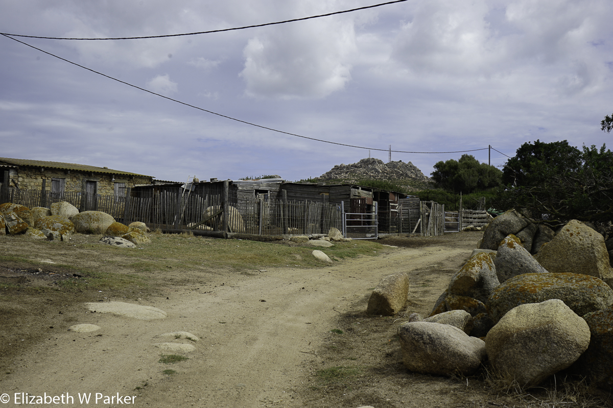 We had lunch in a bergerie – a shepherdess’s digs (Bergerie du Catareddu (Catarello)). The sheep were out, but behind the unpresuming facade on the road, was a campy space with long tables under shade. A pink, flowery home-made runner ran down the center of the broad board table, there were pink napkins for each of us,and jars of flowers served as centerpieces. It was simple and rustic and very welcoming. Pitchers of rosé on the table added to the delightful color scheme. Definitely the food was the focus and we were delighted with the fare!