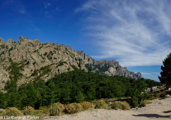 Today we are changing location, leaving our hotel in Sartène to move to the town of Bonifacio for the next two nights. But first – our day’s hike: Today was to be a long day with the hiking estimated to be about 5 hours. We drove a good distance up into the mountains, basically ending up in the area of the GR 20, a famous hiking route through Corsica, like the Appalacchian Trail in the USA. We drove through some darling little towns along the way, and even stopped for coffee and picked up sandwiches just before we reached the parking area for the Col de Bavella, today’s highlight.