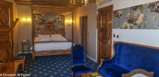 Before we headed out for the evening, we finished exploring the art collection in the hotel. If you look up the Negresco, the art collection is surely a feature you will read about. There are purported to be over 6,000 pieces in the collection, and most are displayed in the corridors and lobbies of the 5 floors. There is also a huge and beautiful rotunda on the main floor with many works arrayed around both sides of the colonnade that borders that amazing ballroom. Some of the work is not to my taste, but those tend to be pieces done specifically for the hotel’s owners, like portraits of children and dogs. But the rest is pretty amazing. A find for us was an artist named René Gruau, who was employed by Christian Dior. (as you look at the pictures, not the carpets – even they are done by a famous artist!)