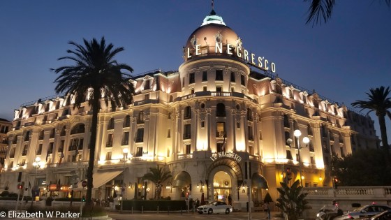 Our hotel in Nice is the Negresco. Yes, yes, it is an indulgence, but one we are gladly making. I first laid eyes on the Negresco when we were here in 2001, on our Euro-year trip with our kids. On that trip, we were in Nice for a frolic on the beach. (It was March and the water was way too cold for me even at that “young” age). The Negresco particularly caught my eye. I think I vowed right then to someday walk through its doors as a guest.