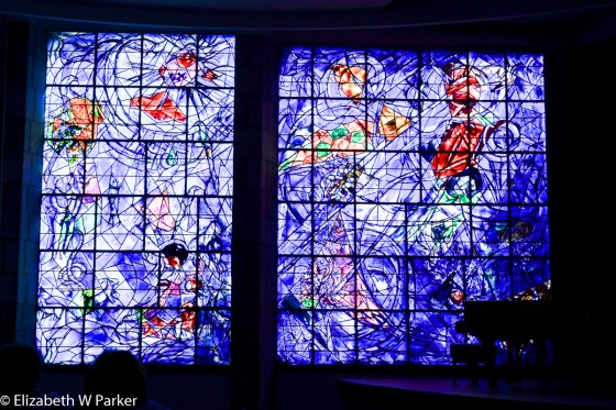 From the Matisse Museum, we began to walk downhill to the Chagall Museum. The Chagall Museum is in a small park, too. Here you purchase a ticket at what looks like the entrance, then go out of that building to another entrance into the display spaces. The main theme of this museum, or at least the exhibition when we visited, was the work Chagall did for the Rosary Chapel in Vence (where the windows are by Matisse). If it seems strange to you that a Belorussian Jew would decorate a Christian chapel in France, be sure to watch the excellent film about Chagall during your visit. The film presents both the man and his work, his successful career as well as the emotional events that shaped his outlook.