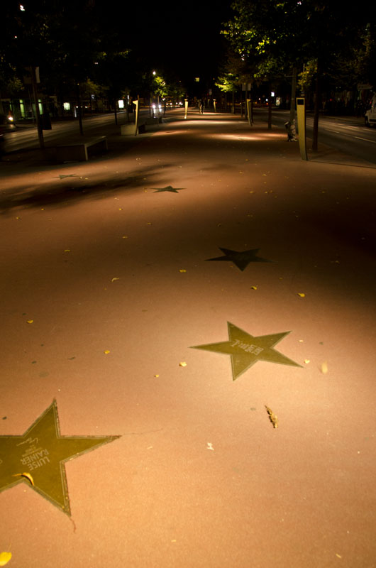 After dinner we went out to take night pictures.  We started out at Potsdammer Platz, a spot we hit on our first night here but were too hungry and too tired to appreciate.  This time we walked around the area, first stopping to look at the walk of fame, the Berlin version of the starred walk of TV and movie stars. There were a few familiar names, of German stars who made it big in Hollywood too, like Marlene Dietrich, but most names were unknown to us.  Interestingly, if you squinched your eyes to just a slit and looked at the stars in the pavement, you could see a ghost of the star (the person) standing on his or her star! Really!  (No, just kidding.  There were these holographic monoculars that you could look through to see the image.  A neat touch!  And, as you can see, they worked for cameras too!)