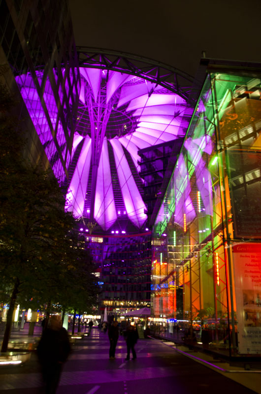 The fantastic lights of the Sony Center were beckoning.  In we went, to an unbelievable fantasy.  The Sony center is a series of buildings united by a common courtyard and covered by a roof of fabric and steel.  Inside the courtyard (and we are talking about a very large space) there are restaurants and shops, a huge fountain and lots of people and lights.  It is really amazing.  The roof changes color continuously (after dark). The lights of the stores and restaurants too are all reflected by the water.  Very, very cool!