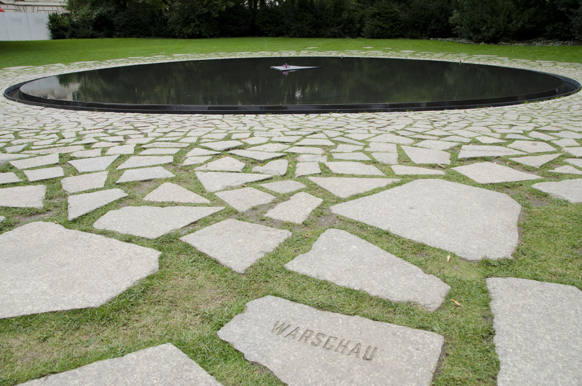 From there we walked just a short couple of blocks back to the Brandenburger Tor, but this time intent to visit the DZ Bank building in Pariser Platz.  Along the way, we stopped to look at the memorial to all the Sinta and Roma people (“gypsies”) who were murdered by the Nazis.  Like the Jews, entire families were sent to the gas chambers. The final tally of the dead was a half a million people. The memorial is a simple round pool of water, surrounded by paving stones that bear the names of the concentration camps.  It is a very quiet, reflective place. (Somehow, this does not make us any warmer to the gypsies that accost us in nearly all the tourist venues.)