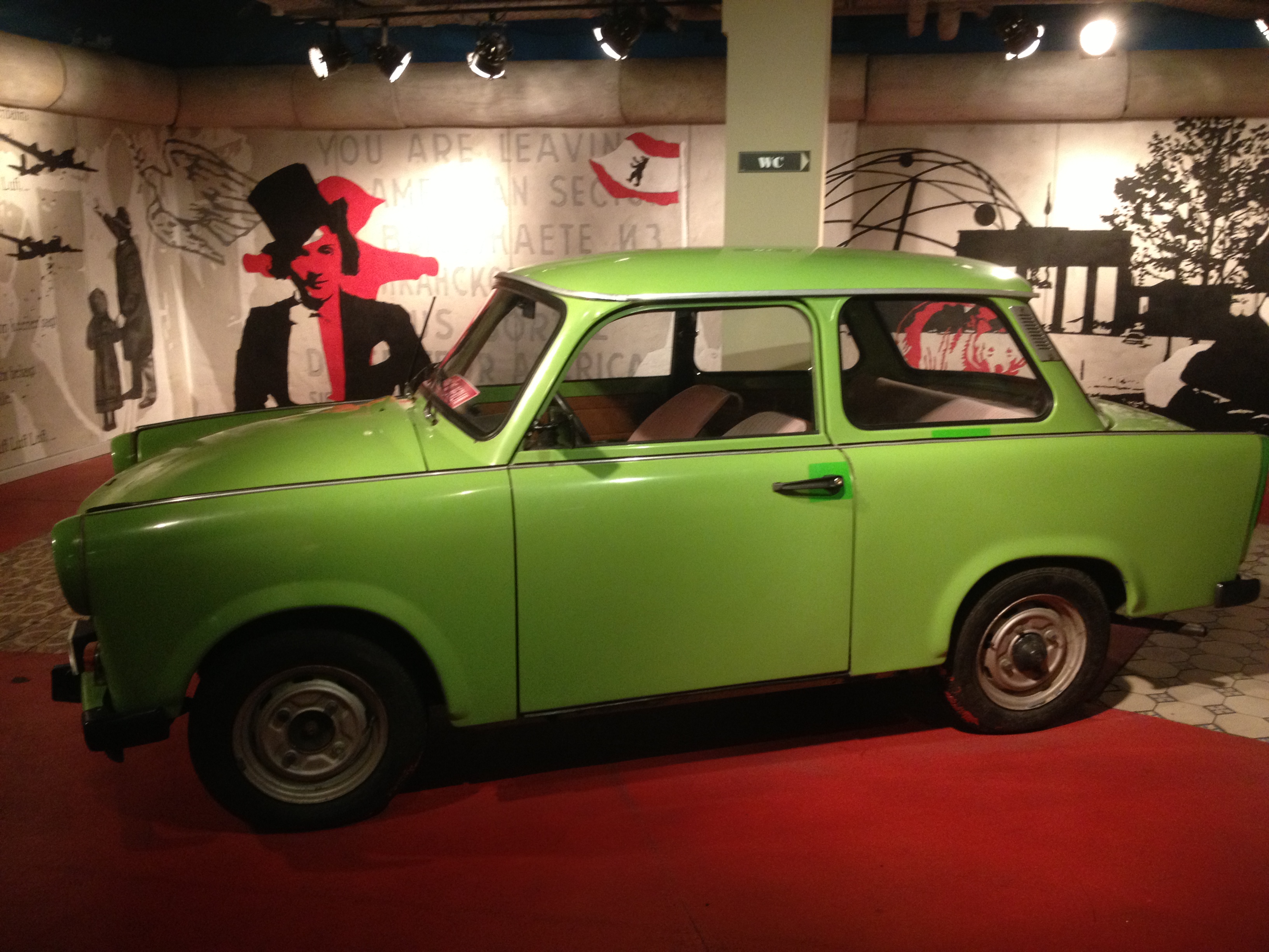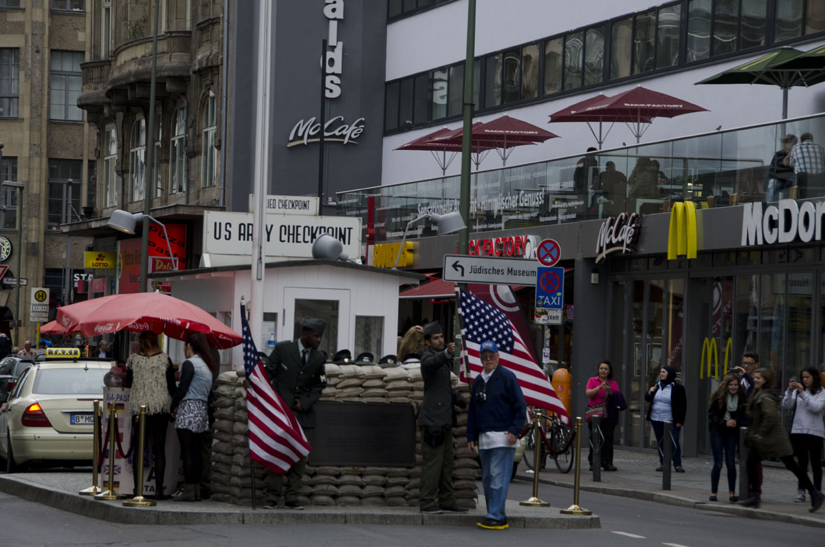 Before the actual Checkpoint Charlie (which is set up in the middle of the street for picture taking), there is a block-long exhibit about this Point and its place in history.  It is very interesting.  The pushing and shoving of the superpowers of the time (the US and the USSR) took place right here.  The exhibit includes lots of pictures from the time, so you can see how the checkpoint was enlarged to accommodate 10 lanes of traffic. You also see some of the ways that people tried to get through to West Berlin and freedom. The exhibit includes diagrams and pictures of the building and “perfecting” of the wall.