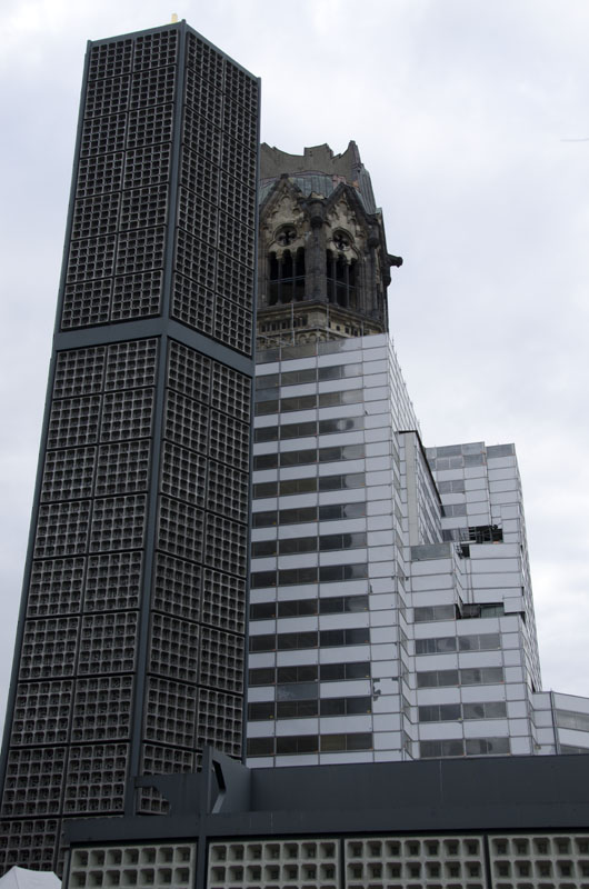 Here in the Breitsheidplatz there is an interesting memorial to the war.  The tower of an old church rises above the modern constructions that surround it.  The tower has part of the roof blown off so it looks like there is a hole, and we hear that Berliners call it the “hollow tooth.”.  Because we didn’t go in, I don’t know whether there is truly a hole or it is just made to look that way at the top.  From the guidebook, I saw that there is a church to visit inside, so maybe more of the ruins are extant than it seems from the outside.  This tower was set up this way as a reminder of the horrors of war.