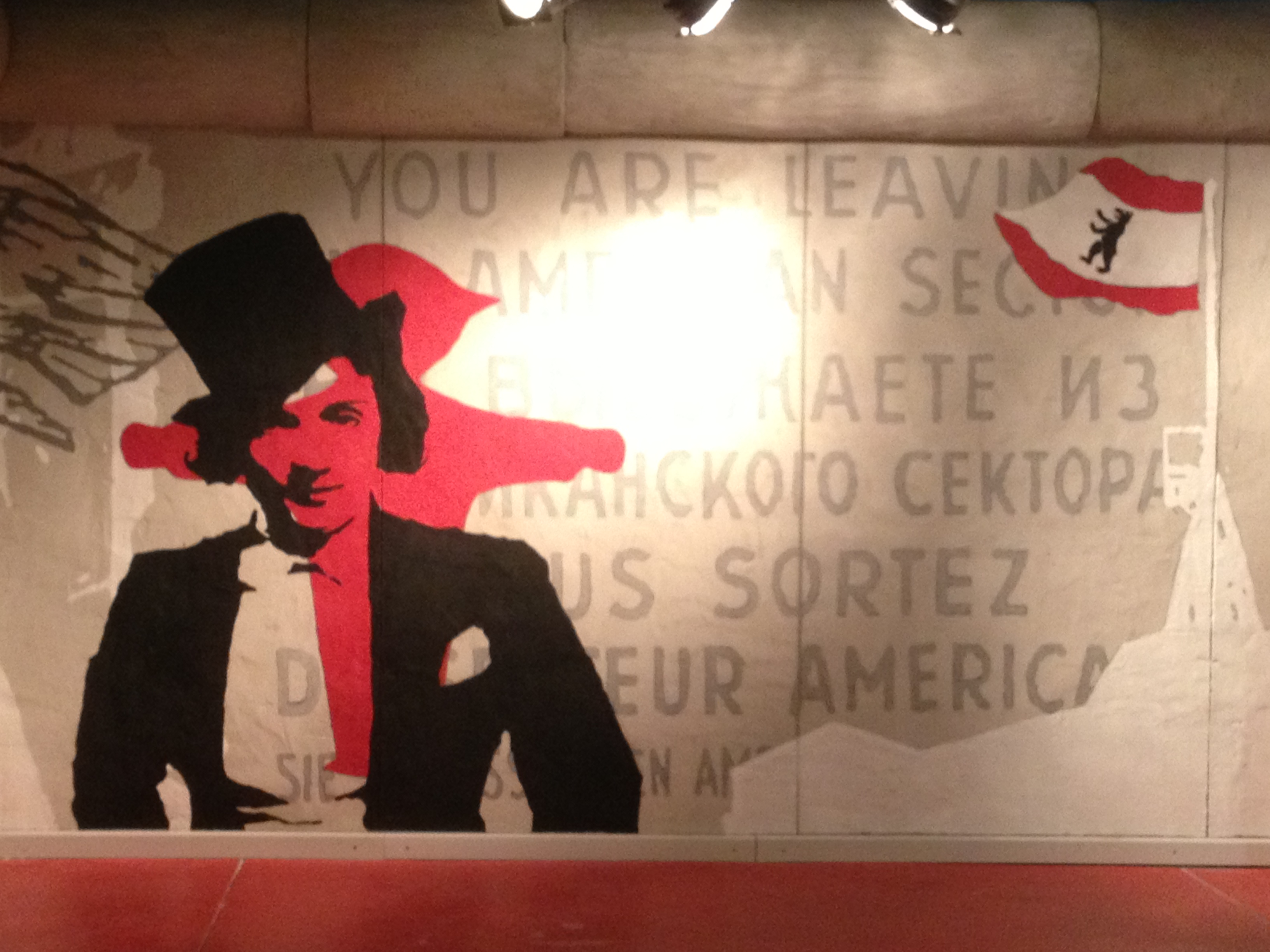 We decided to walk down to visit Checkpoint Charlie, but first an outdoor exhibit in the Pariser Platz caught our eye.  “Diversity Destroyed” it is called, and it is part of a whole series of outdoor exhibits during 2013, the 80th anniversary of the Nazis’ rise to power, and the 75th anniversary of Christalnacht.  This portion of the exhibit focused on the events at the beginning of the Nazi regime, when Jews were still being forced to leave Germany, deprived of their livelihoods and harassed on the streets.  The day is beginning to have a Second World War theme, which will play out.
