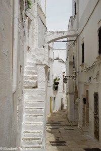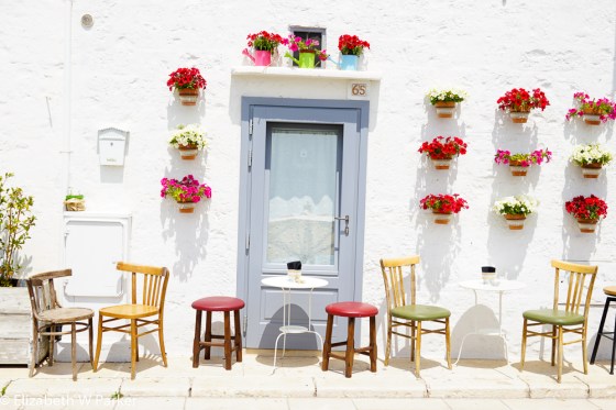 We, instead, continued to Locorotondo (lo-co-roh-TON-doh), another of the “Most Beautiful Burgs in Italy.” I have decided that in order to get that designation, your town needs to have lots of flowers in pots all over the place. Doesn’t bother me! The name Locorotondo makes the town sound like some kind of crazy rotunda, however, it comes from Latin: loco (place) rotondo (round). [Not quite so suggestive!]