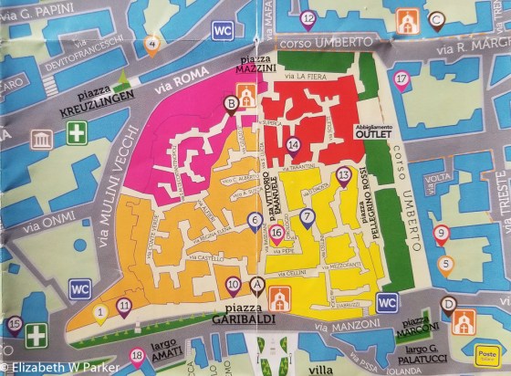 This tourist map shows the 4 sectors of Cisternina, and the little alleys and offshoots. Can you find the entrances to the old city? we entered right by the ‘N” in Mulini Vecchi.