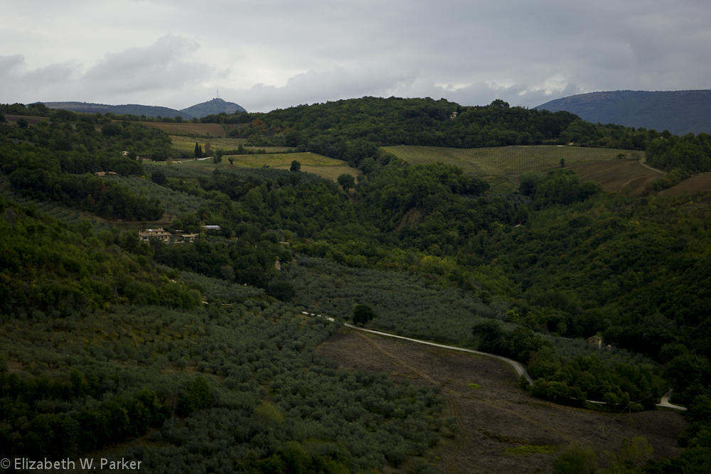From our starting point, and accompanying us much of the walk downhill, the views of the valley are tremendous. We can see Assisi, on the side of Mount Subasio, appropriately looking like a monk’s tonsure, We can also see villages like Spello and Collepino. The city of Perugia looms to the distant left. Squinting really hard, maybe we also see Gubbio on the distant horizon. It is a patchwork of our walks, our meals, our days in Umbria.