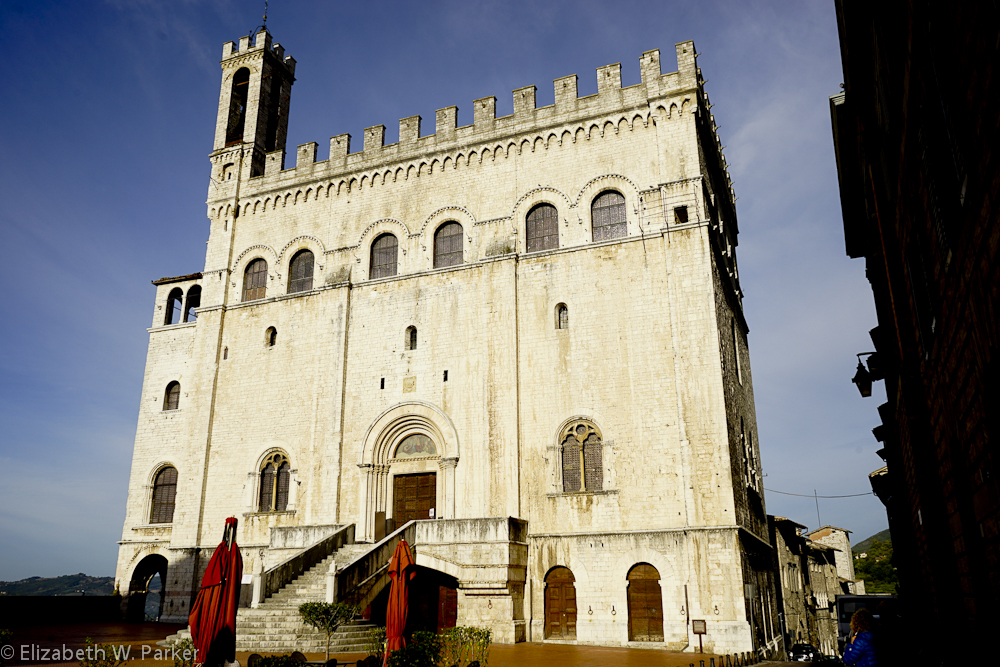 We walked down and back to town, as I said, along the road that teams race with the ceri in the May festival. We walked all the way back to the hotel. Coming from above, we walked into the tiniest square I have ever seen between two important buildings, anywhere! The buildings were the Duomo and the Palazzo Ducale (after which our hotel is named).