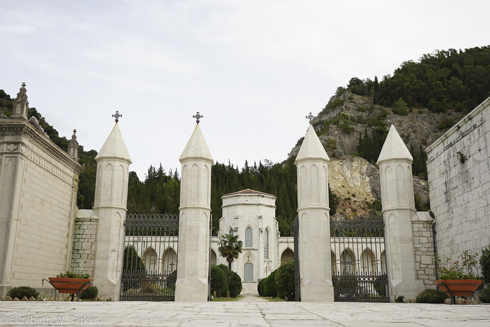 Abruptly we were back in civilization, ending up at the town cemetery. Our vans transported us a short way to the base of a funicular…I guess that’s what you would call it! I had never seen one quite like this – Two of us got into each ”cage”, standing up and rode to the top of the mountain. The views were spectacular, once I got over the fright of the contraption and my general distrust of heights. Just one glimpse backwards toward the valley, and I forgot all my misgivings about the conveyance. Wow. What a view! The funicular deposited us where we had started earlier in the day, but now on the other side of the Basilica of Saint Ubaldo.