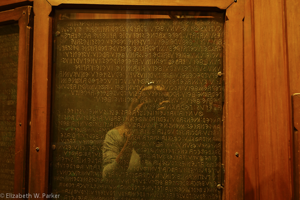 With my free time, I went to visit the huge building flanking the main piazza, the Palazzo dei Consoli, which houses a museum filled with Roman remains from excavations as well as a pinoteca. But the most interesting item in the museum is a series of tablets written in Umbrian, a language that pre-dates Etruscan, which of course you know is another people who inhabited Italy before the rise of Rome. They are called the Iguvine Tablets and they date from the 3rd century BCE to the 1st century AD. I was startled to see that the Umbrians used both the Latin characters we are familiar with and the Etruscan character to write the tablets. They describe religious rites and are really a significant archaeological find.