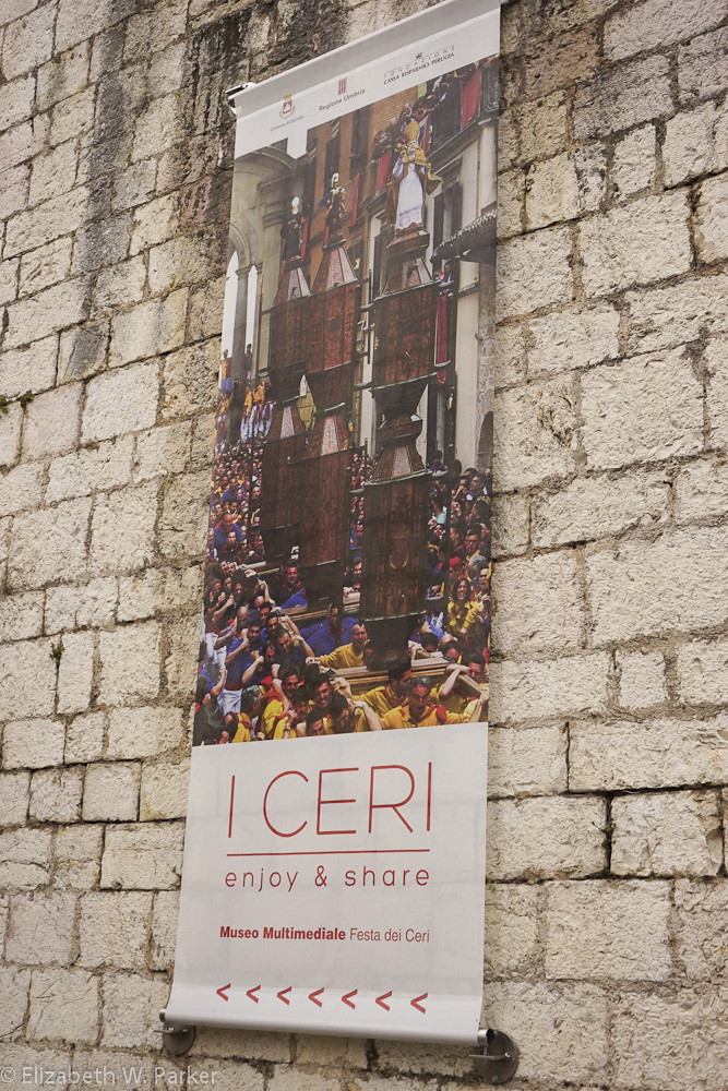 After lunch we walked down the race way – shorter than our morning walk, but steep enough to make you wonder at the prowess of the young men who make it up the hill carrying the heavy ceri in 13 minutes!! The ceri bases seem to be made of wood and they are quite large. Each is topped by a statue of a saint (there statues are kept in a different church in town and we did not see them). The festival takes place in May.