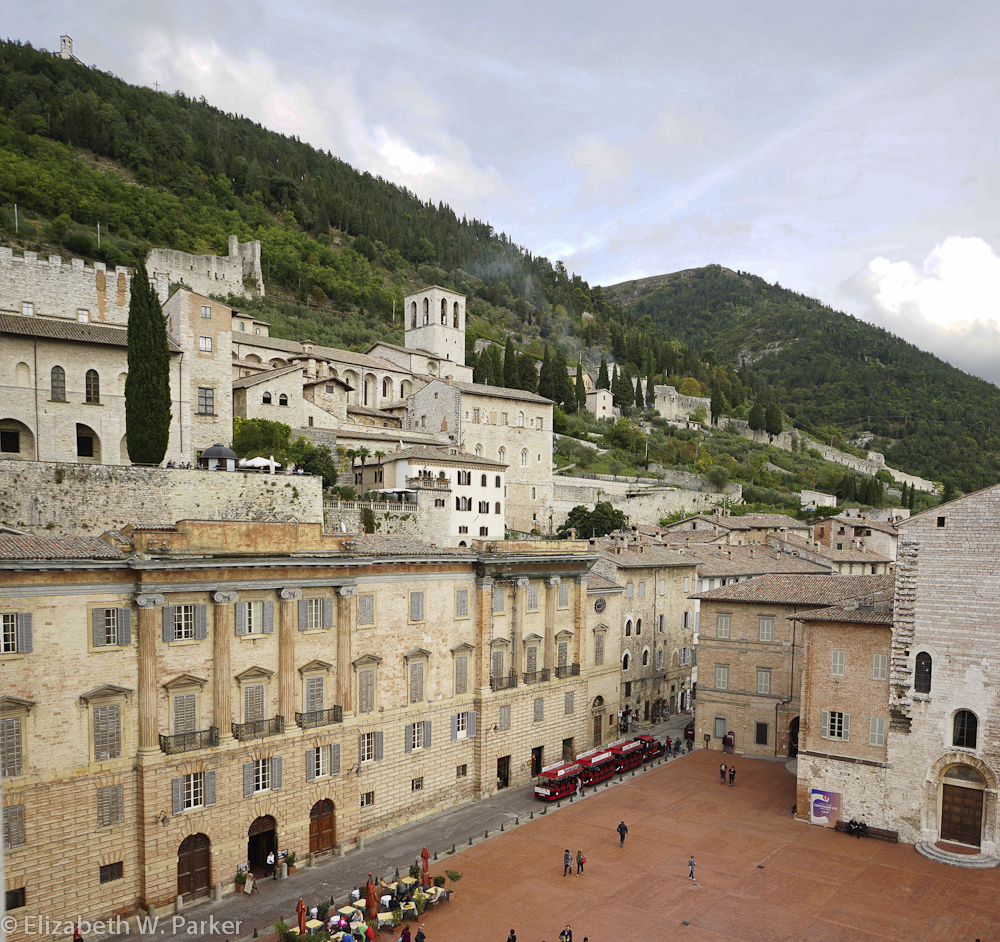 This is a shot I took from the loggia way up on the Palazzo dei Consoli of the piazza below. Note how Gubbio is built up the rising hill. Explains why their are elevators for short cuts from top to bottom! Ps our hotel entrance is the middle door of the three in the second building from the left at the level of the road.