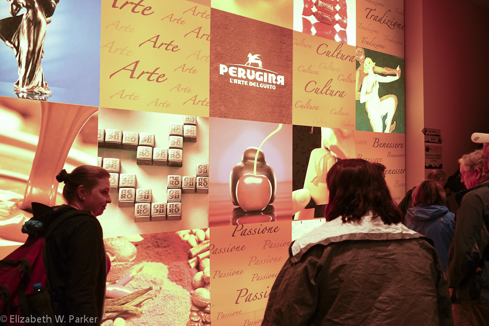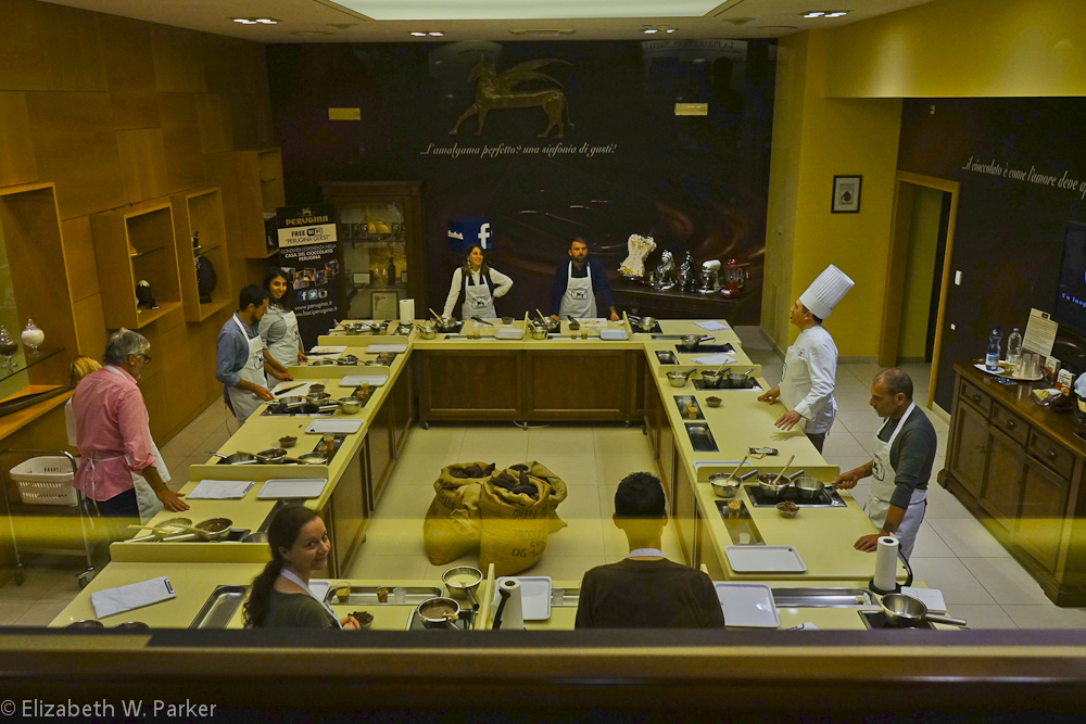 We were up and out of the hotel, bags and people in the vans around 9:30. The day is rainy as the weather report predicted. Fortunately, we are flexible and instead of walking in the rain we will walk to the aroma of chocolate: We’re going to the Perugina factory to learn how to make kisses.