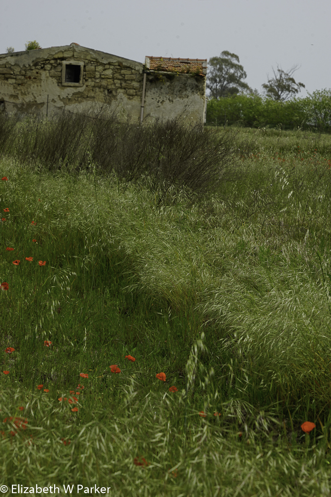 We were overwhelmed by the spring wildflowers. There were lots of yellow, daisy-like flowers, mixed with exuberant red poppies, whole fields of them. We found a scenic-ish spot and got out of the car to take some pictures. Nothing like an abandoned farm building with a field of flowers to catch the essence of rural Italy!