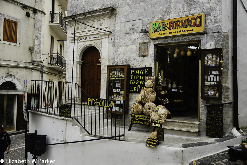 We had a beautiful day for a drive along the coast. (Today we are on the northern edge of the Gargano Promontory.) The steep descent to the water was covered with forest habitat. Tall trees, mainly pines, shade and screen our view down to the water and the beaches. We stopped in Peschici to shop for picnic food.