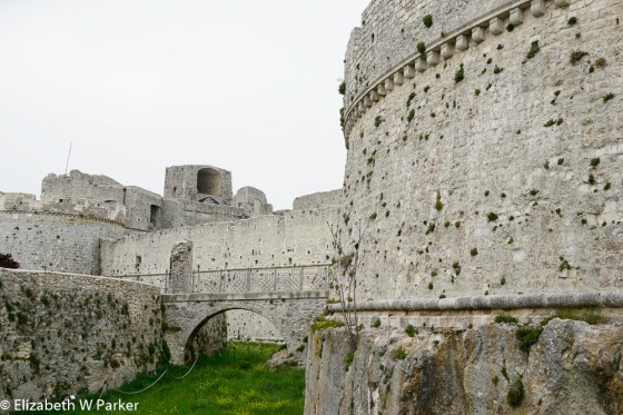 From the church, we walked up a steep staircase to where we had left our car, and “discovered” the ruins of a medieval castle. This is one of many, many Norman-Swabian-Aragonese castles that dot Puglia – the Castello di Monte Sant’Angelo. The earliest parts date from the 9th C. but the castle was used and reused by subsequent dynasties, hence the hyphenated name.