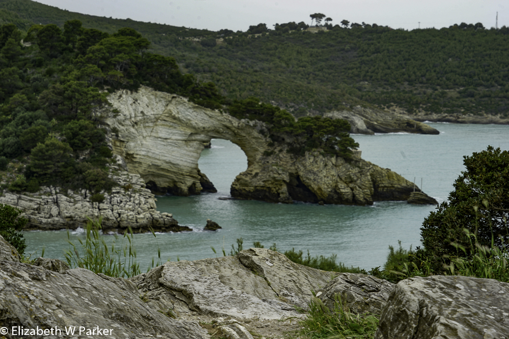 There were also vast vistas from the ramparts. There was a deep and distinct haze in the sky – definitely humid – but cool and not really threatening rain – but damp. Back in the car, we followed the switchbacks down the mountain and regained the coastal road traveling northward, up along the lower edge of the Gargano Promontory.