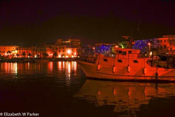 Last night we didn’t get in until almost 8 (most of that time spent crawling along streets within the huge crowds). At 8:30 we went out to walk along the port and had dinner at La Rosa dei Venti. We had a very pleasant evening: It was cool, the temperature coming down from the mid-70s, the port was lively with people and music. Our mood was good and our food was good! We loved the chef, who was very accommodating. Our waiter was fun, too. He spoke Italian, of course, but also a smattering, literally, of English, Spanish and German, so we had quite a potpourri going trying to order.