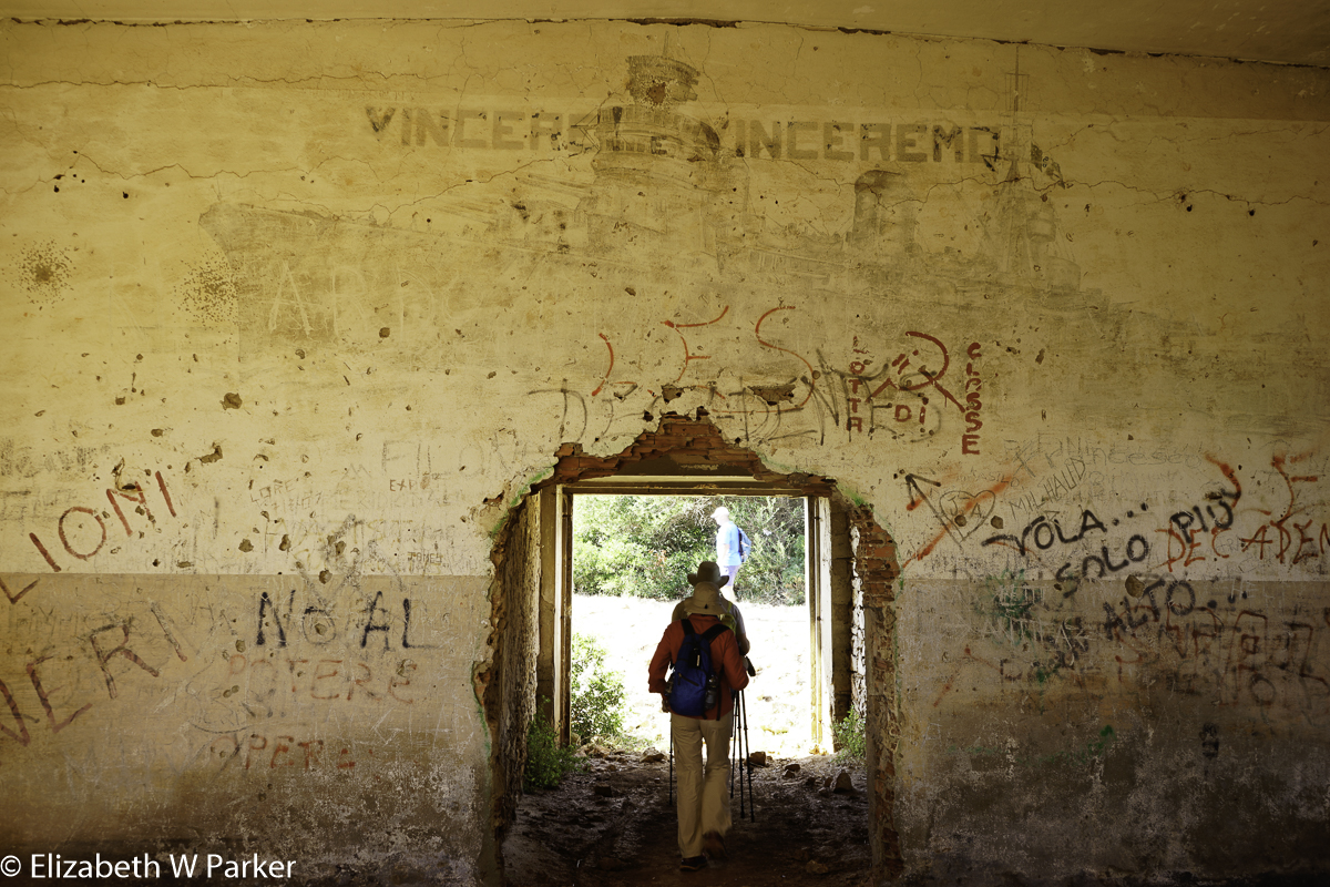 Walking a little farther along our route we came upon the barracks used by Italian (Fascist) soldiers awaiting the arrival of the Americans. Though the building is pretty much a wreck, there are still graffiti and Fascist slogans on the walls. The end of our hike was down next to the water. We had a chance to swim. Today, I brought my swimming suit in my backpack and had to change into it, but it was so worth it to get into that water. We cooled off yes, but it was so refreshing to move our legs in a different way from the walking and work all the kinks out. We also had a picnic lunch in a little grove of trees above the beach, before a short, hot walk back to the vans.