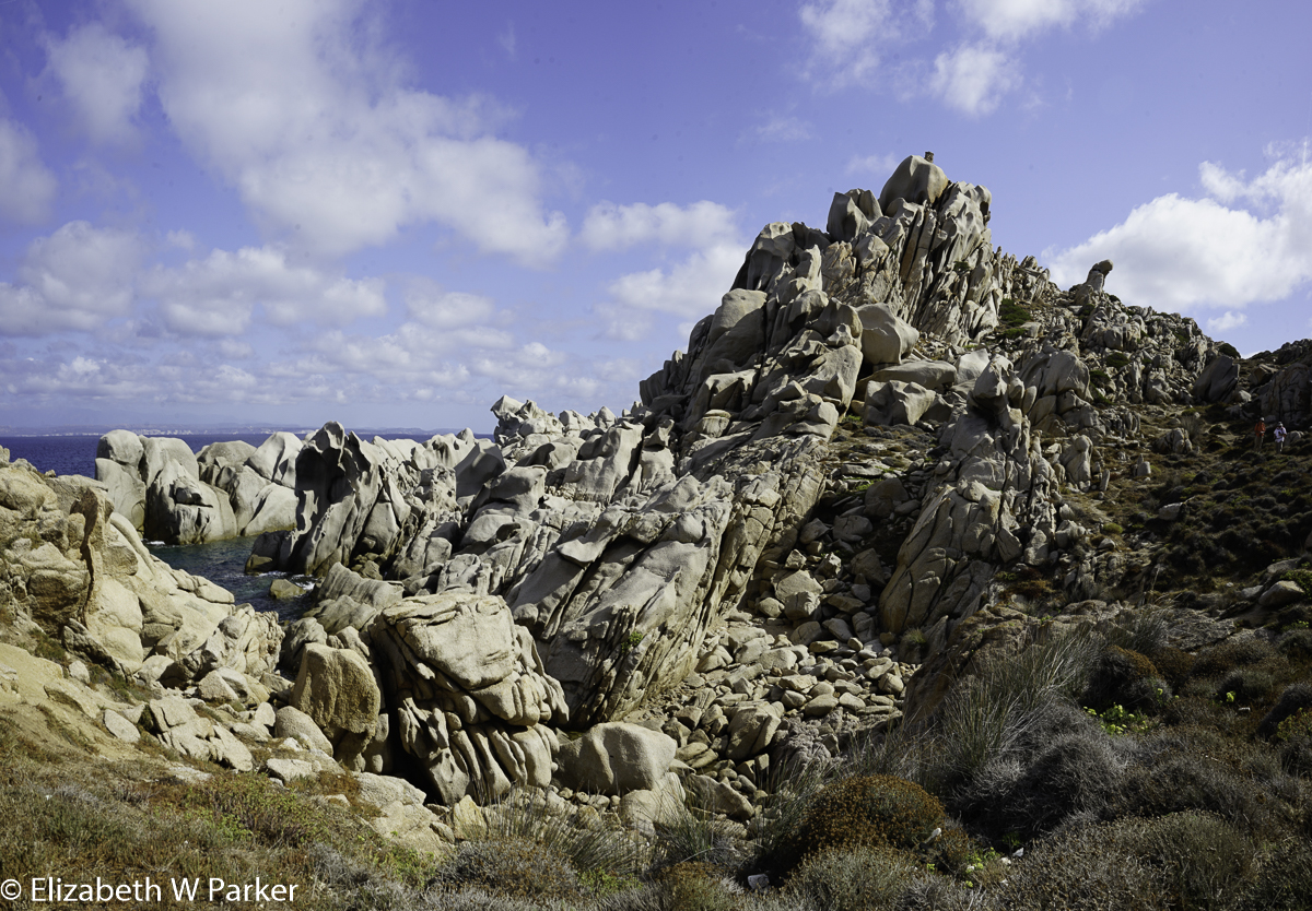 We disembarked at the little resort town of Santa Teresa di Gallura. Here, we parked our vans at the Bocche di Bonifacio restaurant and began what will be everyone’s favorite day hiking among the bounders of Capo Testa. We are at the northwestern tip of Sardinia and Capo Testa is a ginko leaf-shaped peninsula that bursts out of the coastline, connected only by a sand bar.