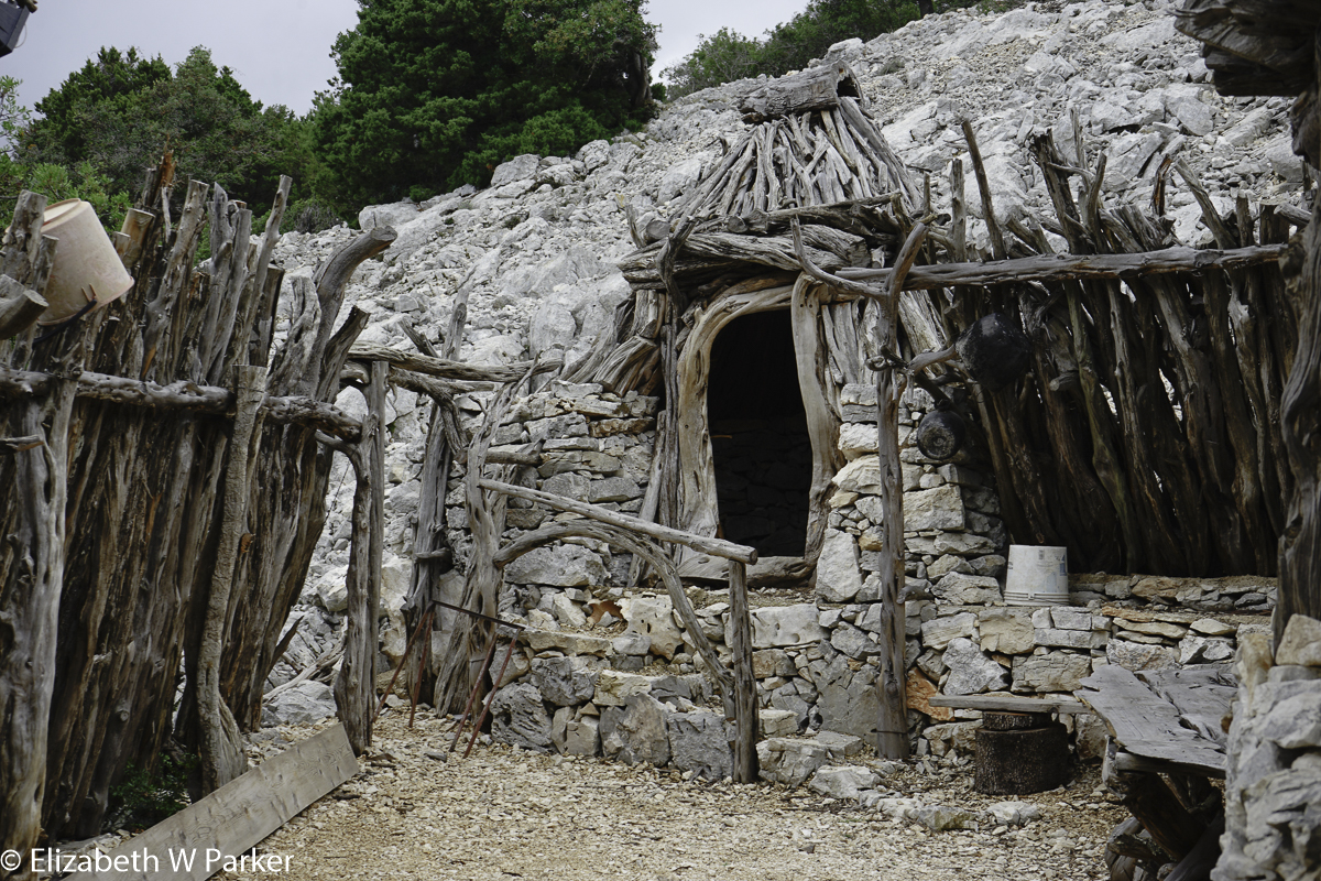 Several aspects of this visit are worth mentioning. Lino, up here all day with time on his hands while the goats are off grazing, has built not only built the required conical shelter, but had built a second smaller one and a bathroom for guests. Using intricately curved and worn juniper, he had also fashioned gates and a covered terrace for his lunches. His seemed adept at using the ubiquitous stones, too. The effect was very pleasing to the eye, all grey and white, against a landscape that was white and green. He mentioned that his grandfather’s plot does not have access via a road, like his does. The road means he can entertain tourist groups, fortunately for us.