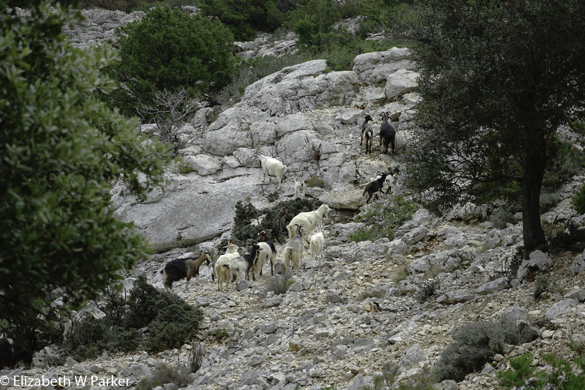Today’s hike is in terrain that reminds me of Mallorca – very stony. The white rocks are dotted by the green of juniper bushes, all very rugged and remote feeling. Unfortunately, as I reached into the back of the van to capture an errant hiking pole, something popped in my knee. Severely hobbled by the pain, I could not hike with the group – a fairly easy walk up a single track cement road to the holding of a goatherd. Instead of walking, I went in the van, arrived early and was able to listen to the goatherd and Stefano conversing and to learn a bit about the place before the others arrived.