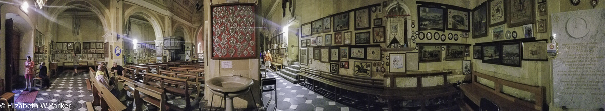 The interior of the church is fascinating. The walls, literally every inch of vertical space inside is covered with ex votos. If you’re like me, you have heard the expression ex voto and not a clear explanation of what it means. Ex voto is Latin for “in fulfillment of a vow” and in practice is an offering made, in this case to Saint Constantine, in gratitude for a prayer granted. Here, there are paintings, photos, poems and totems, but the vast majority are silver hearts, which in the muted lighting of the church, sparkle with tiny stars. It is really moving to walk among the columns and pews, reading the stories that accompany these offerings. Whether you believe in this sort of thing or not, the faith of those who do is inspiring.