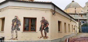 The first was a visit to the Mediterranean Mask Museum in Mamoiada, a town near Nuoro. It is hard to know how to start to explain to you what this town is famous for and how it unfolds … here’s a stab at it. As part of the Carnival celebration (Carnival as in carnevale, the lead up to Easter), there is an annual parade of frightening characters called mamuthones – men dressed in shaggy sheepskins, wear black wooden masks and weighed down with cowbells of all sizes. The festival is very old and may originate in a pageant to address the bad spirits and fears of the rural population before a new growing season begins. The other major character of this festival is the issohadores – men dressed like gendarmes who control the mamuthones on leashes.