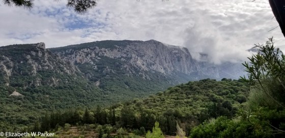 After lunch, full to bursting as we have been after every meal, whether restaurant or picnic, there was a rain shower. To hike or not to hike? Despite the rain, the better part of the group decided to go down to the sea on foot. It was not an option for me with my knee. Gerry and 3 others also opted out. Just as we waved good-bye to the hikers, a downpour basically drenched the area. I was worried about their safety, as the trail could be quite slick with the rain. (They all made it – Soaked and muddy – but no one injured!)
