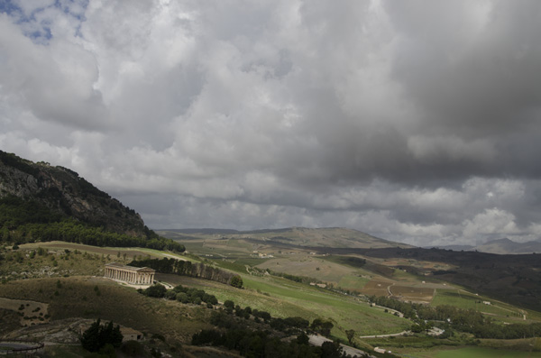 Our first stop was Segesta.  The first thing you see in Segesta and the thing that your eyes keep returning to is the temple.  It is so stately and majestic, as it sits all alone on the crest of a hill, surrounded by mountains and valleys.  We had a perfect day to see it, too!  There were plenty of puffy white clouds in the sky, so that we could see the temple sunlit, while the surrounding landscapes were in shade.  It is quite impressive!  We hiked up the long hill on the other side of the temple first. From all along the way, one just had to peek backwards to see the perfect proportions of this Doric temple and admire the workmanship that created it.  I actually think we are fortunate to see it as it is now, and not as it was to the people living here in the 5th century BCE.   We get to see it pure – free of its adornments (or possibly the scaffolding of its construction)- and we can admire it in a landscape devoid of competing structures and sights.  We can imagine it as the monument to something eternal that it is, man’s quest to be at one with the controlling forces of the universe.